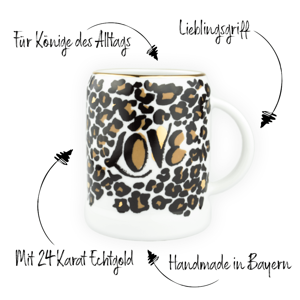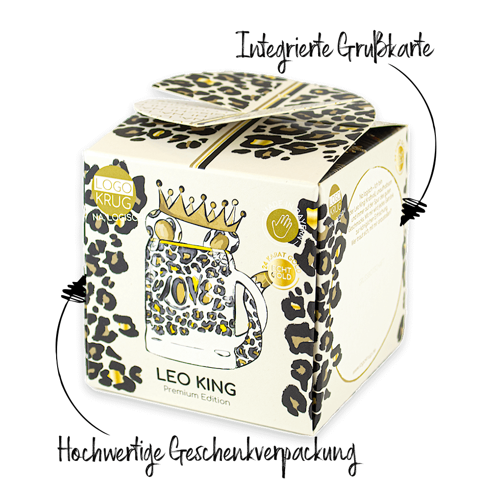Er betritt nicht den Raum – er füllt ihn. Der Leo King ist kein gewöhnlicher LOGOKrug – er ist ein Statement für Stil, Charakter und Präsenz. Mit seiner kraftvollen Ausstrahlung, dem handgezeichneten Leo-Muster und edlen 24kt-Echtgold-Details – wie dem handgemalten Goldrand – ist er gemacht für diejenigen, die wissen, was sie wollen. Stark im Ausdruck, edel im Detail – und definitiv nichts für den Durchschnitt. Ein Premium-LOGOKrügerl für Könige des Alltags, stille Leader und alle, die ihren eigenen Weg gehen.
