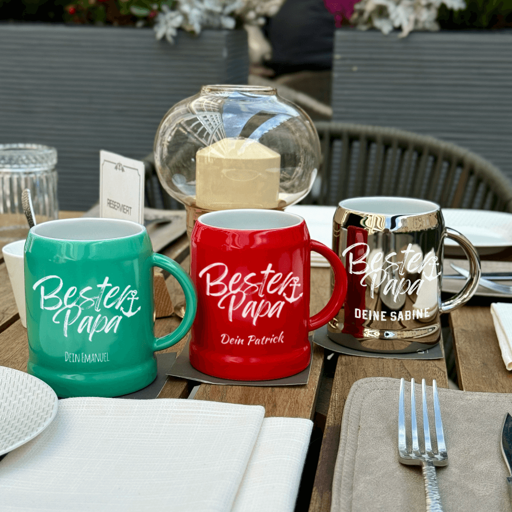 Er ist da, wenn man ihn braucht. Immer. Der LOGOKrug mit der Gravur „Bester Papa“ ist eine Liebeserklärung an alle Väter, die zuhören, lachen, tragen und stärken. Ein Danke für starke Schultern, gute Ratschläge und offene Arme. Die Gravur kann durch einen Namen personalisiert werden – für ein Geschenk, das sagt: Ich hab dich gesehen. Und ich hab dich lieb. „Manche Helden tragen keinen Umhang – sie heißen Papa.“