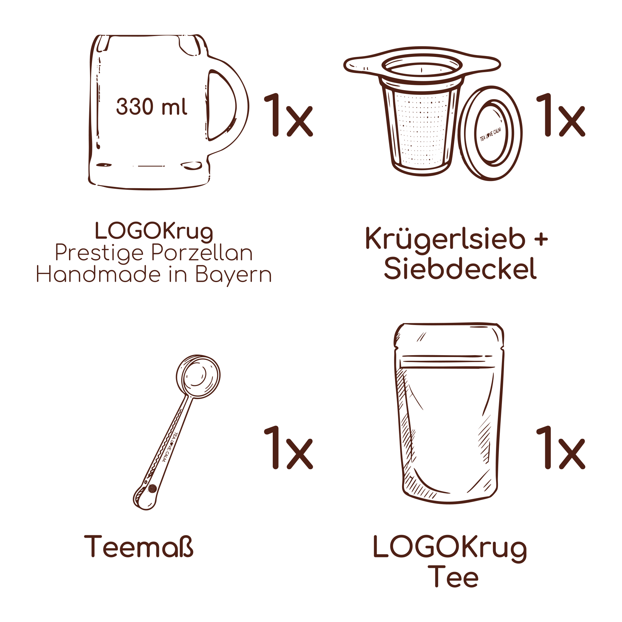 1x 330 ml personalisiertes LOGOKRÜGERL in einer deiner Lieblingsfarben, dazu unser Bio-Weihnachtstee, unser passendes Krügerl-Sieb mit Deckel und ein Teemass zum Anklippen.